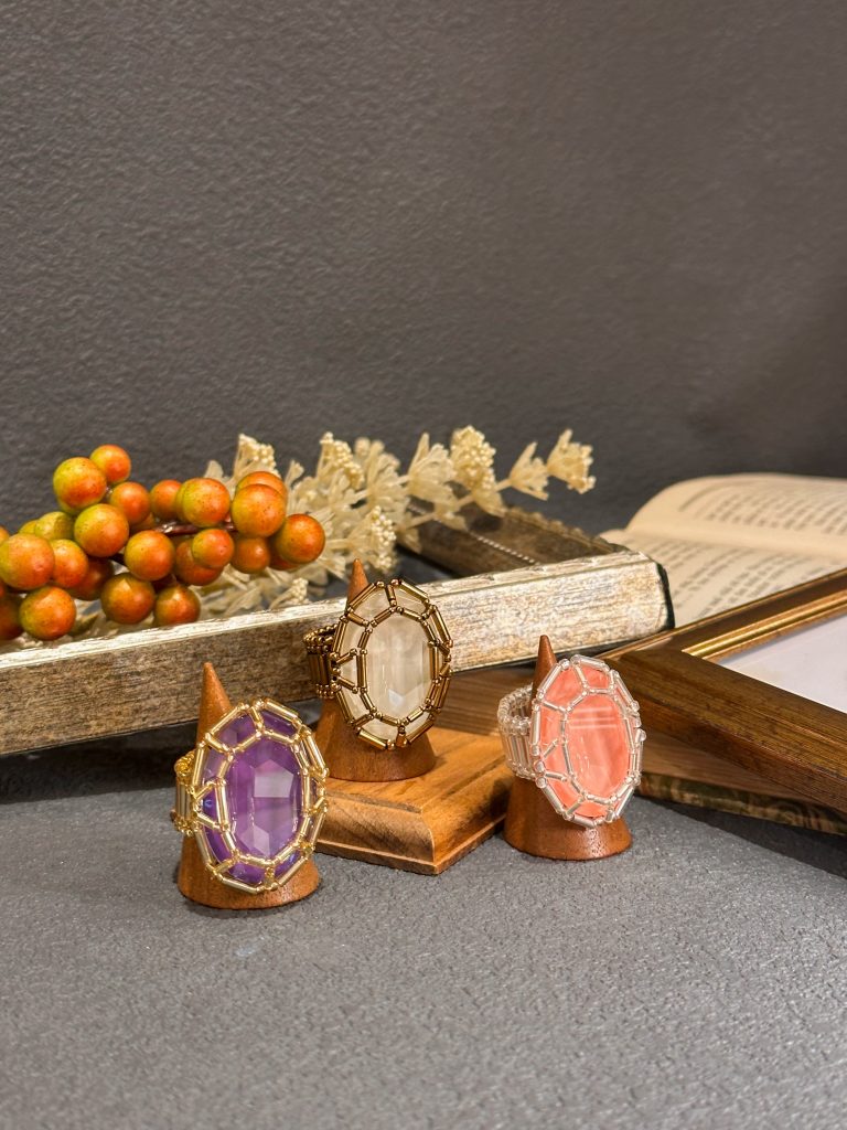 まるで宝石のカットを描くように貴和クリスタルを編み包むこのデザインを「宝石編み」と名付けました。